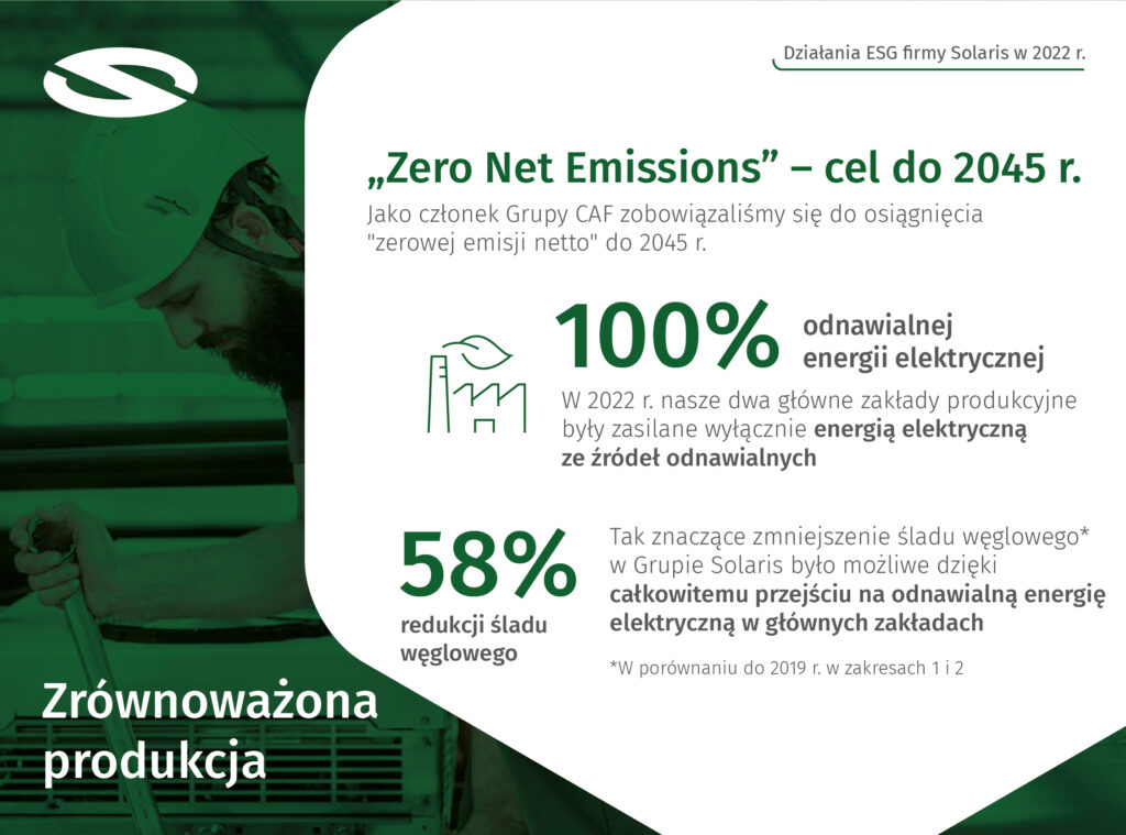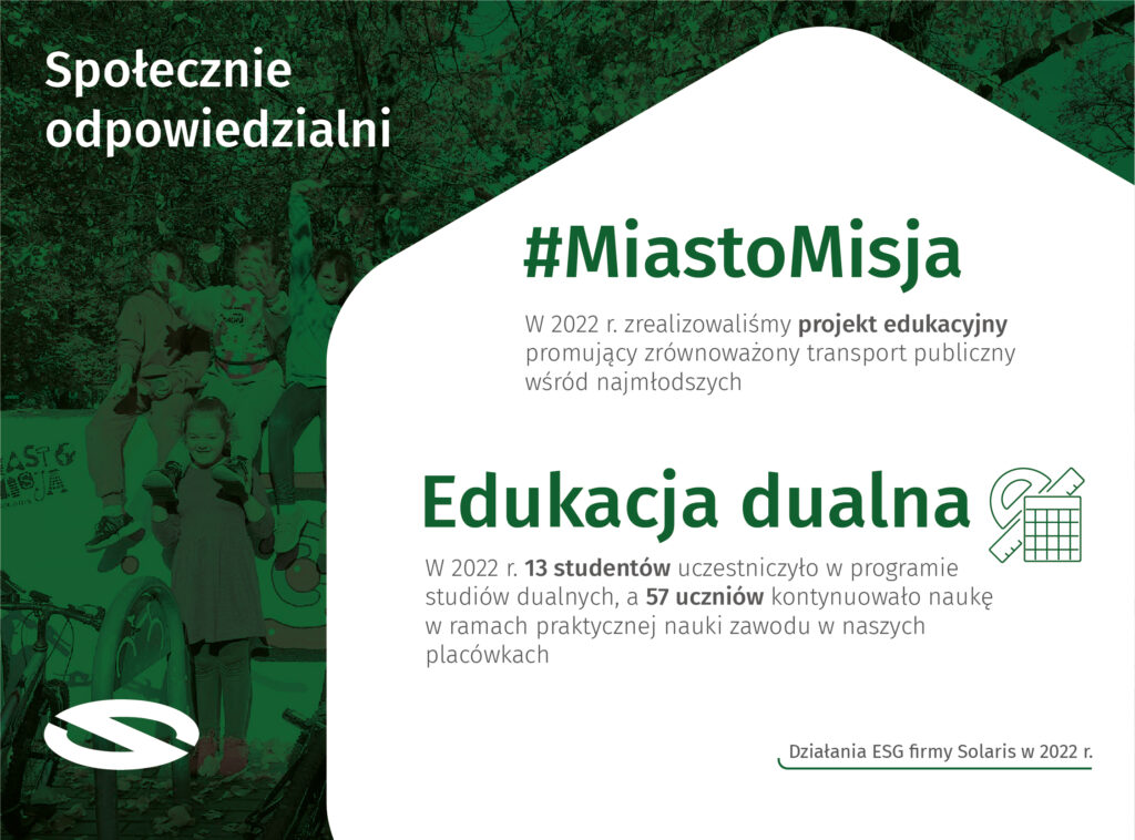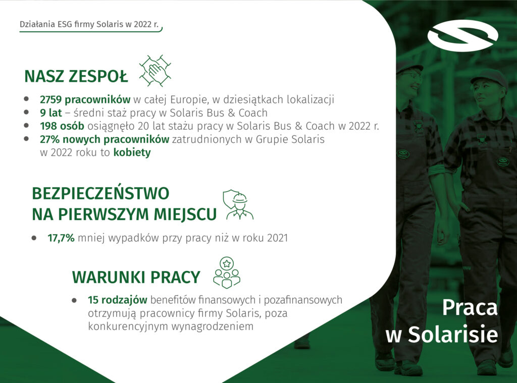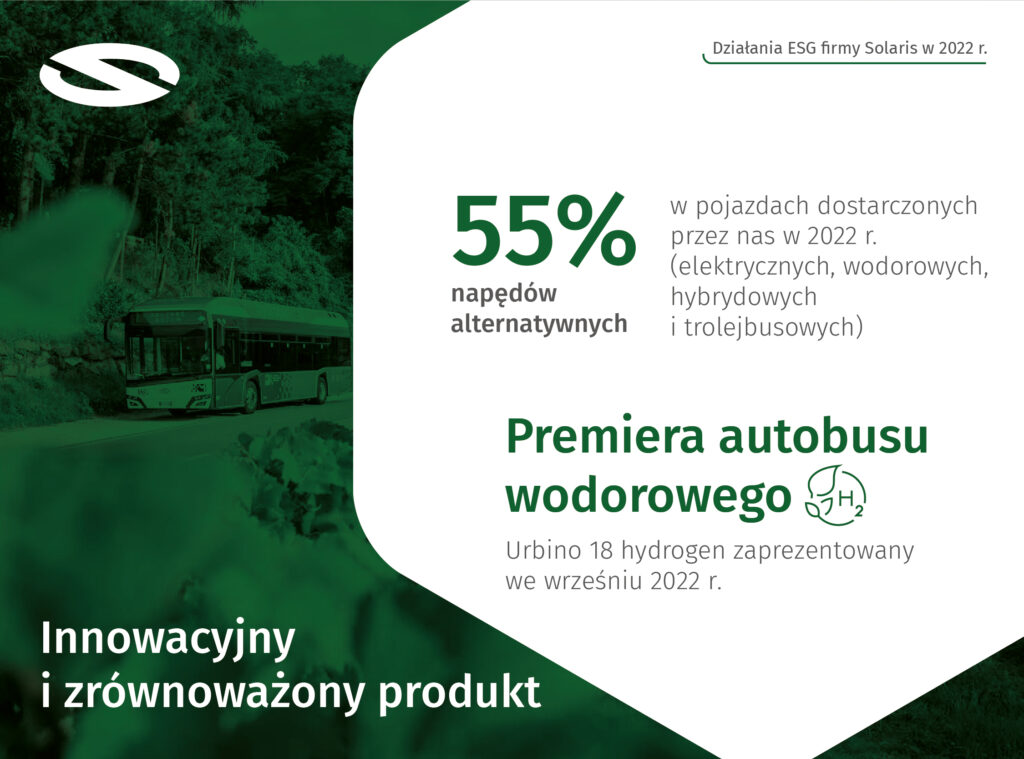 Solaris przedstawił najnowszy Raport zrównoważonego rozwoju, prezentując wyniki swoich działań na rzecz zrównoważonej przyszłości, podejmowanych w roku 2022. Na kartach raportu firma w przekrojowy sposób podsumowuje miniony rok w zakresie rozwoju czystych napędów, minimalizowania wpływu na środowisko i aktywności związanych z przestrzeganiem najlepszych standardów ładu korporacyjnego oraz odpowiedzialności względem ludzi – pracowniczek i pracowników oraz społeczności lokalnej.